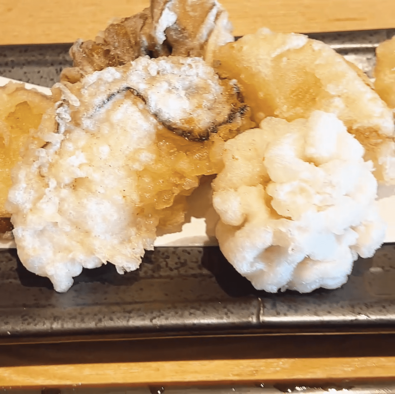 冬の天ぷらは、牡蠣、白子、下仁田ネギ、おでん大根、まいたけ、紅はるか。